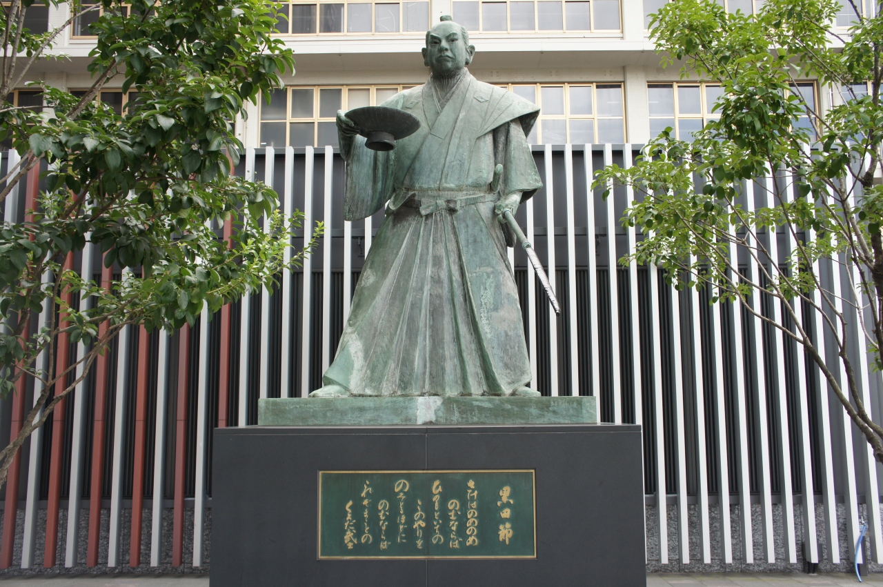 博多駅前にある母里太兵衛の黒田節の碑にご挨拶。母里太兵衛は黒田家の重臣。黒田長政の名代として、福島正則邸に挨拶に行った際、正則から酒を勧められ、いったんは固辞するものの、強く勧められるので、やむを得ず大杯の酒を飲み干し、その褒美として名槍日本号を正則より譲られたという逸話が有名。それを歌ったのが、黒田節です。