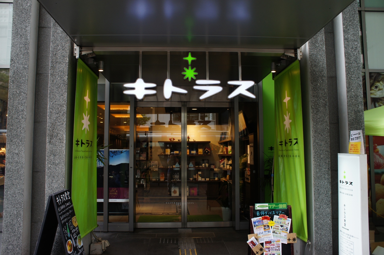 川端通り商店街の入口にあるキトラス。けっこう人の出入りがあって、つられて入ってみました。ここは、長崎・佐世保・雲仙市が合同で出店したアンテナショップのようで。おみやげ品を扱うほか、食堂があったり、3市へのツアーの紹介なども行っています。