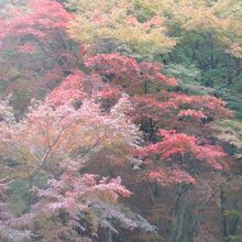 秋の紅葉シーズンには、山間の谷間に落ち着いた風情で広い公園には折り重なるようにもみじが色づきます。