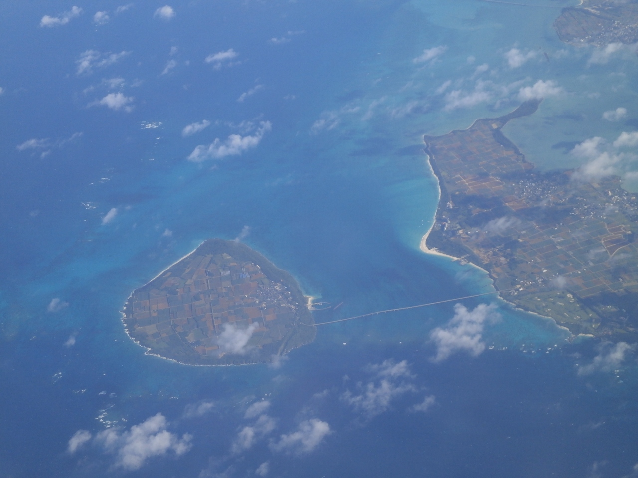 那覇~石垣のフライトから来間島の全景を見渡すことができます。那覇→石垣は右側、石垣→那覇は左側の席に座ると見ることができます。