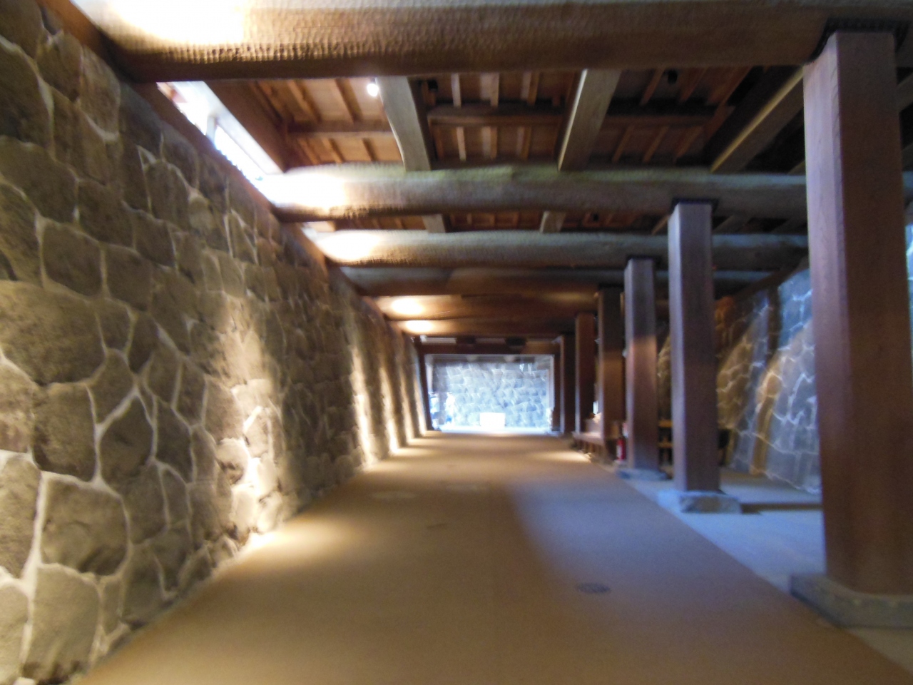 本丸御殿の下にある通路で、石垣の上に掛けられた梁や巨大な柱が並んでいるのは