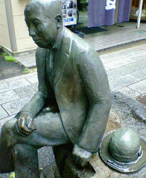 宮沢賢治の座った像で、物静かな雰囲気の表情と小脇に置かれた帽子、きれいに剃られた頭から壮年期の姿を思わせます。