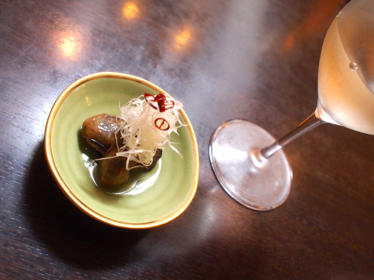 せっかくなので広島の日本酒をチョイス。焼き牡蠣と、オイル漬けと一緒に。