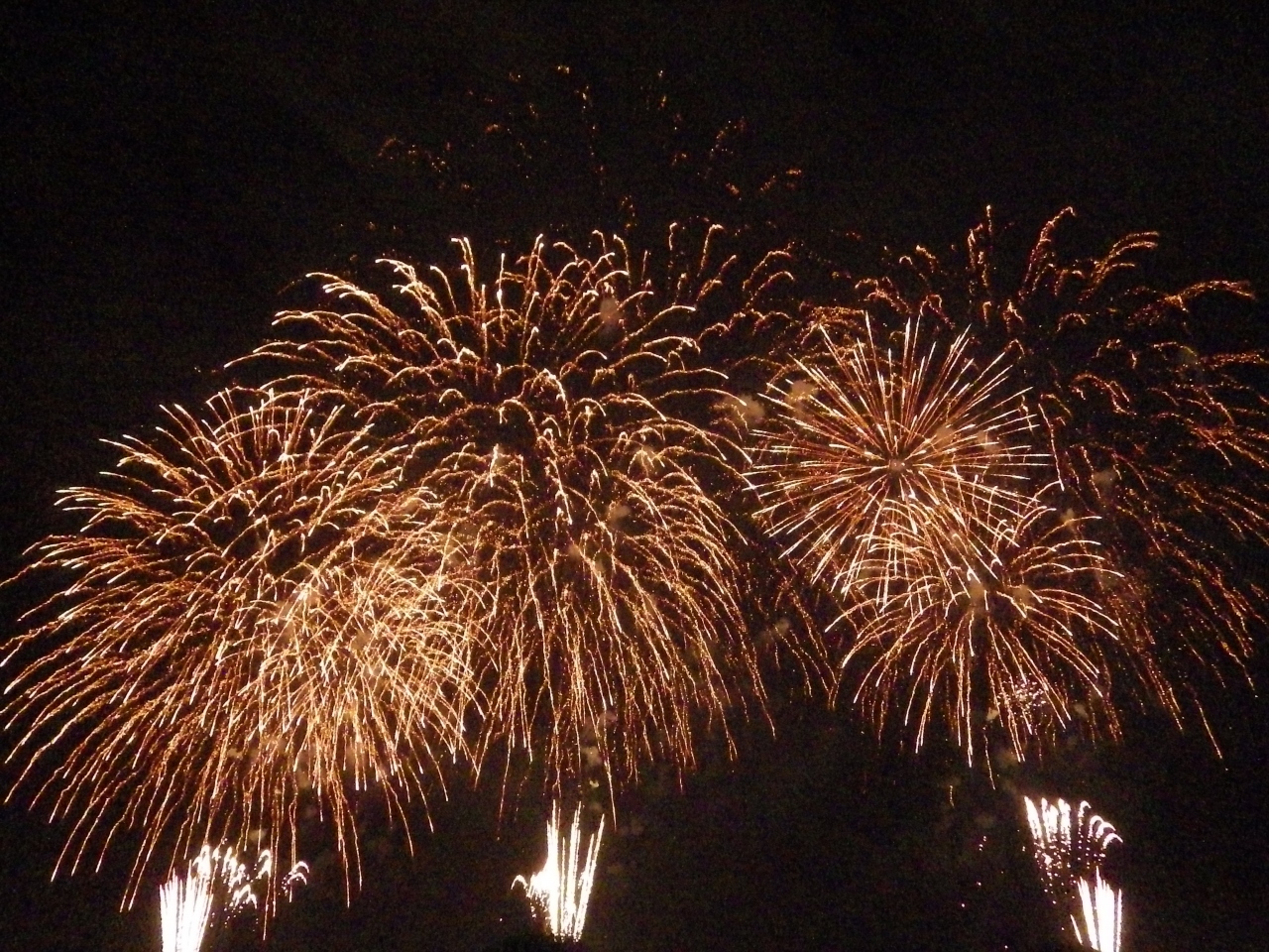 三尺玉花火は600メートルの高さにまで上がるとのこと。はじめの方で1発、中ほどで1発、最後のフィナーレに1発。大きく開いた花火はカメラのファインダーから溢れそうに大きかったのです。