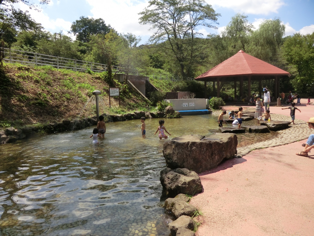 春から秋まで長い間水深20センチ程度の池、流れがあり、遊ばせることができる。