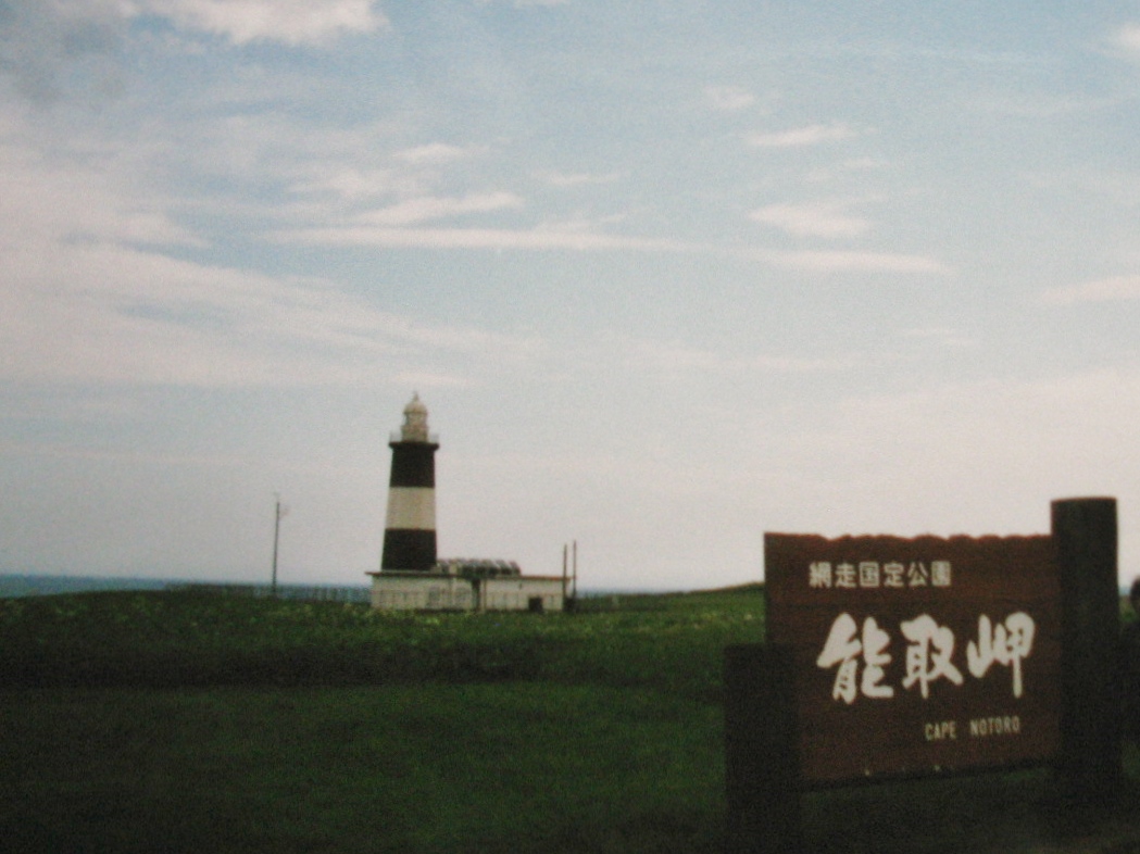 「能取岬」は、網走市街から、道道76号線を車で走って30分足らずところにあります。道道から能取岬につづくわき道行くと牧場があり、牧草地の中をオホーツク海に向かって進むと行き止まりに駐車場があります。岬には黒と白の縞模様の灯台がありました。灯台付近は広大な草原で牧歌的な雰囲気が広がります。岬の周囲は絶壁で海に降りることは出来ませんが、オホーツク海と能取湖を望む絶景のスポットです。