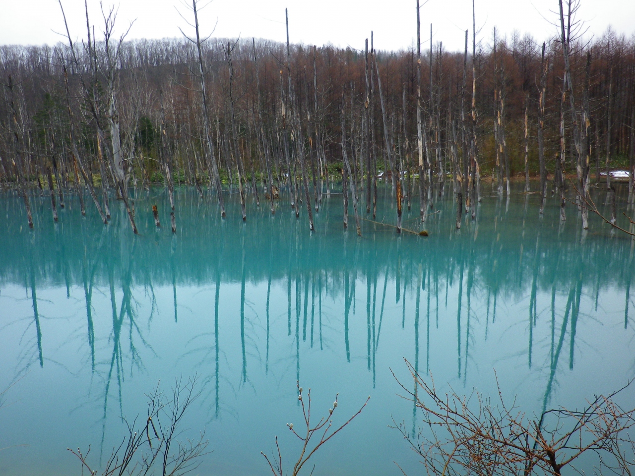写真などで何度も見ていましたがほんとに乳白がかった青い池でした。