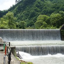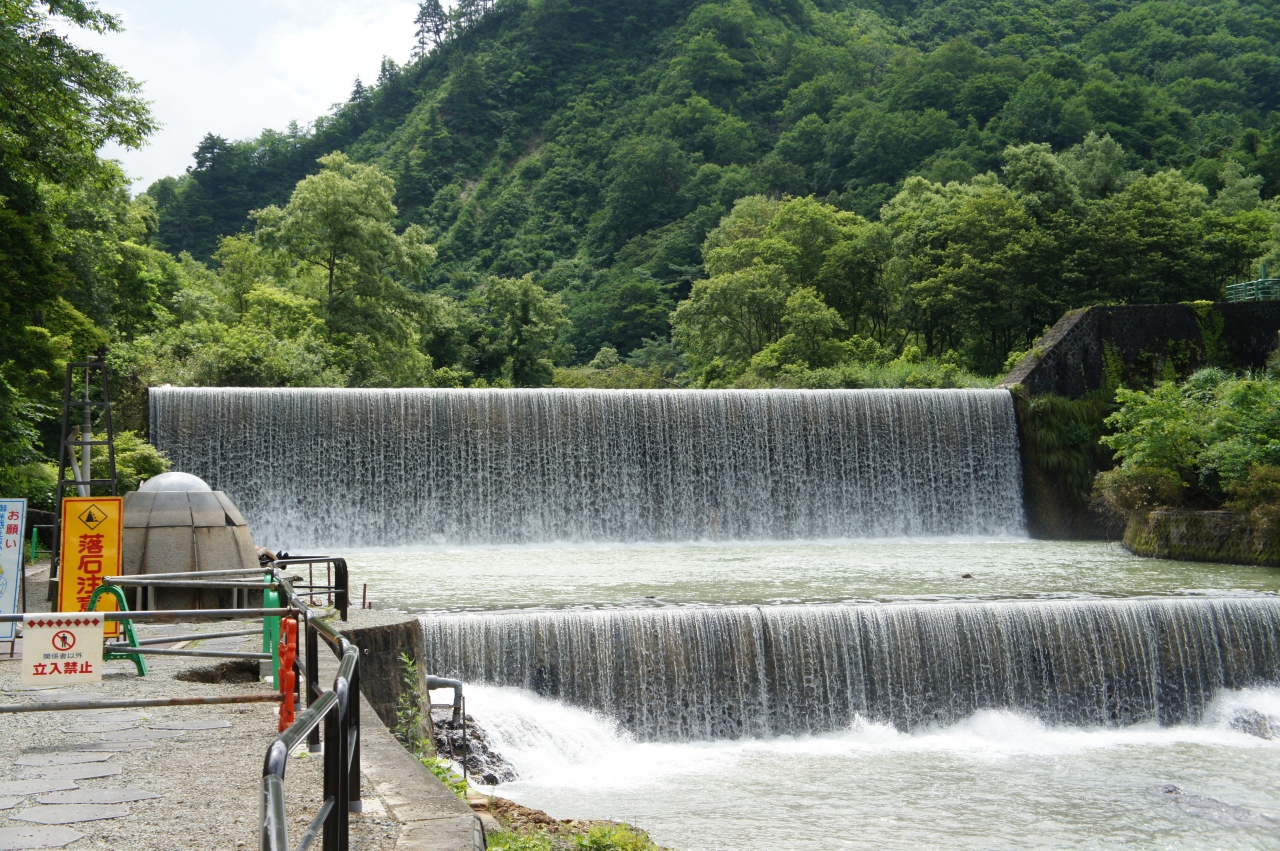 肘折温泉街の中心を流れるのは銅山川。その上流、市街の端に、肘折砂防えん堤という砂防ダムがあります。よくある砂防ダムなのですが、遊歩道から眺める滝の流れ落ちる勢いは意外に迫力があって、ダイナミック。築後50年を経過し、国の有形文化財へも登録されているようです。