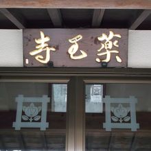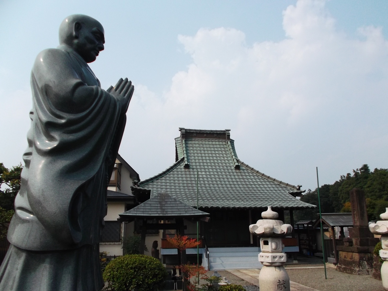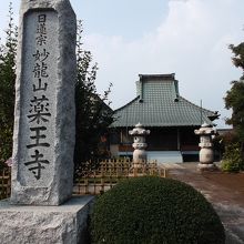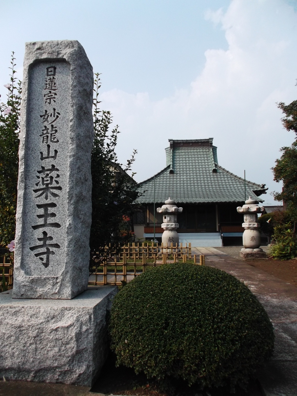 日蓮宗妙龍山薬王寺の石柱の向うに日蓮さんの立像が、さらに目を遣るとちょっと特徴のある屋根の本堂がありました。中央が突き出ているのです=珍しくありませんか。これを見に来る寺社探訪者さんもいるのでしょうね。