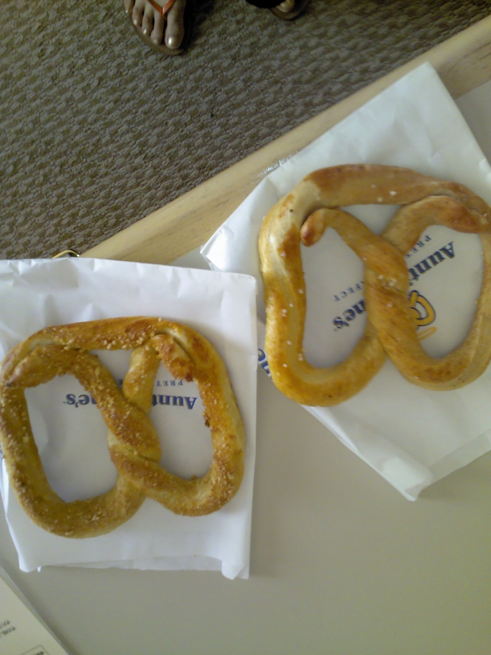 関西では京都にあるだけで大阪では食べれないので、楽しみにしてました。ソフトプレッツエル専門店ですよね!!月曜なのに夏休みのせいか満席でテイクアウトにしました。