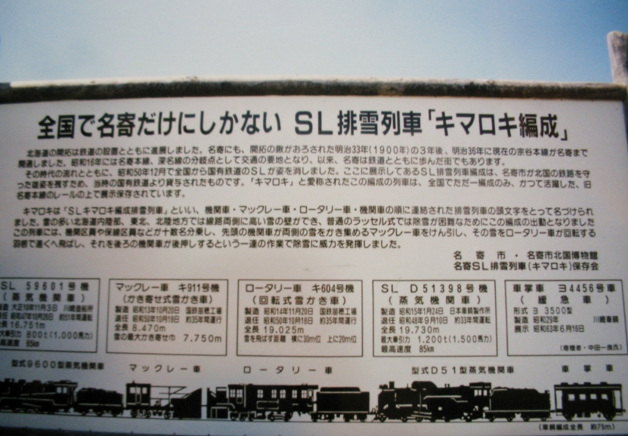屋外には博物館の正面に、国内唯一の「機関車・マックレー車・ロータリー車・機関車」によるキマロキ編成の排雪列車が展示されていました。