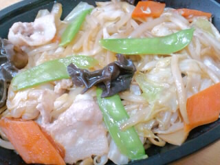豚肉、キャベツ、玉ねぎ、にんじん、きくらげ、タケノコ、ピーマン、もやしetcが入っていました。