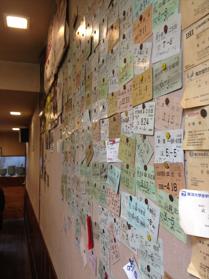 ラーメン二郎 (ラーメンジロウ) では、店内に来店者が名刺を置いていっているようで、多くの人が訪れている事が判ります。特に、遠く、大阪や九州、北海道の名刺も有って、人気がうかがえます。ぜひ、一度、ラーメンを食べにいってみては