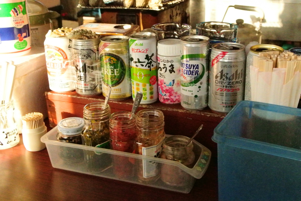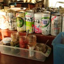 目の前に並べられた瓶詰のおつまみたちはセルフで食べれます。