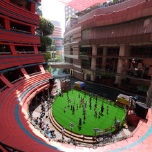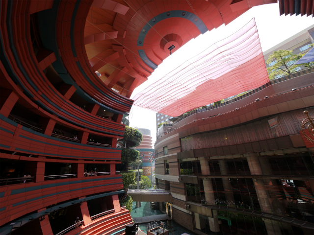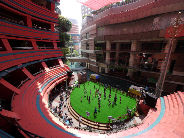 ムーミンカフェのために行きましたが、とにかく大きい商業施設でした。夏休みの時期でしたので、中央の広場では子供たちがウォータスプラッシュを浴びてびしょ濡れになっておりました。涼しげな光景でした。円形劇場のような造りで、季節ごとにイベントをやっているようです。パブリックアートがあったり、似顔絵書きさんがいたり、アートな要素が多くあります。建物の色合いも鮮やか。