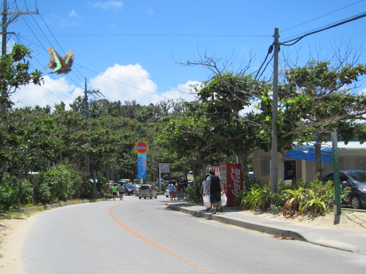 道路を挟んで左側がビーチ入口、右側にレストハウスと駐車場がありました。