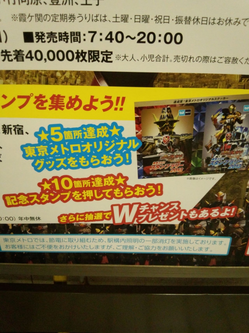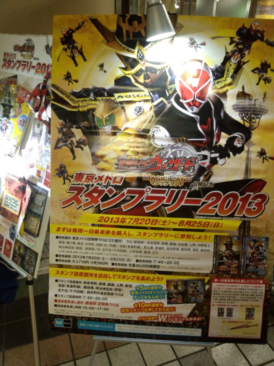 JRのポケモンスタンプラリーは黄色が目立って派手ですが、この地下鉄ラリーは渋めの色彩で いかにも地下って感じを出しています。地上は40℃になった所がある程暑かったですが銀座はソニープラザの手前辺りから三越まで丸の内線 日比谷線 銀座線など地下鉄駅があり 各ビルのB1と地下通路が繋がっているので 涼しくて快適です。しかし 地下鉄の仮面ライダースタンプラリーは通常の定期券が使えないので大人の付き添いが若干少なめでお子さまの数が目立ちます。大人1人でお子さま3~4人って感じさえしますが 初めに仮面ライダースタンプラリー専用の1日乗車券入れのストップを貰えて 他にもプレゼントがありますので これも外せないイベントです。今年はお盆なのに東京から品川間がかなり混んでいる事と関係ありかもしれません!
