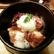 アイス、カスタードクリーム、小豆、白玉、黒蜜がトッピングされてて800円。