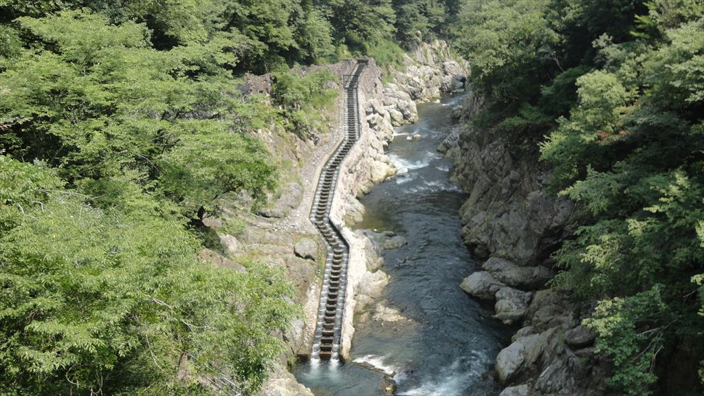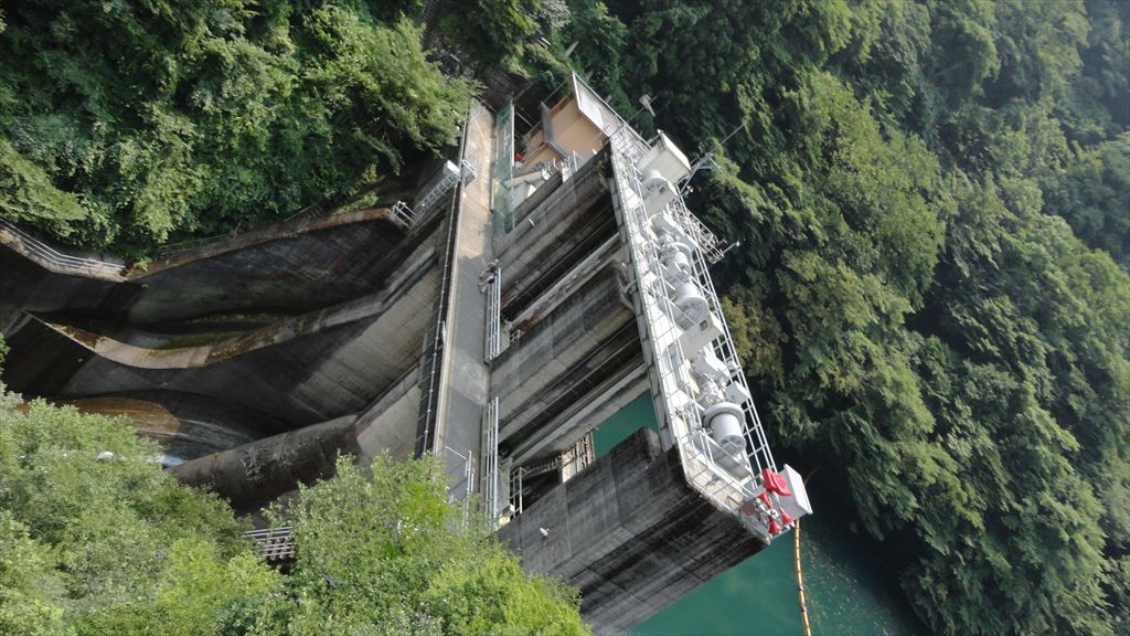 まず螺旋階段を下りてダム魚道を見学、土日祝のみ公開。奥から出てダムの上に行くと下流にオープン魚道があります。ダムをわたっていくとハイキングコース。数馬・白丸駅方面は崩落のため通行止め。鳩ノ巣小橋まで下って渓谷歩いて500m。