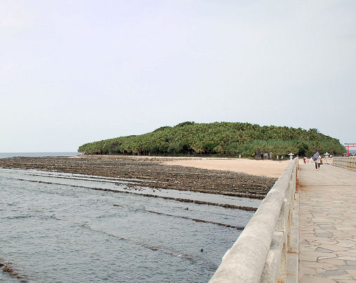 その上を、若者や家族連れ、さらには外国人観光客たちがぽつりぽつりと渡り、青島神社の鳥居の下をくぐっていました。
