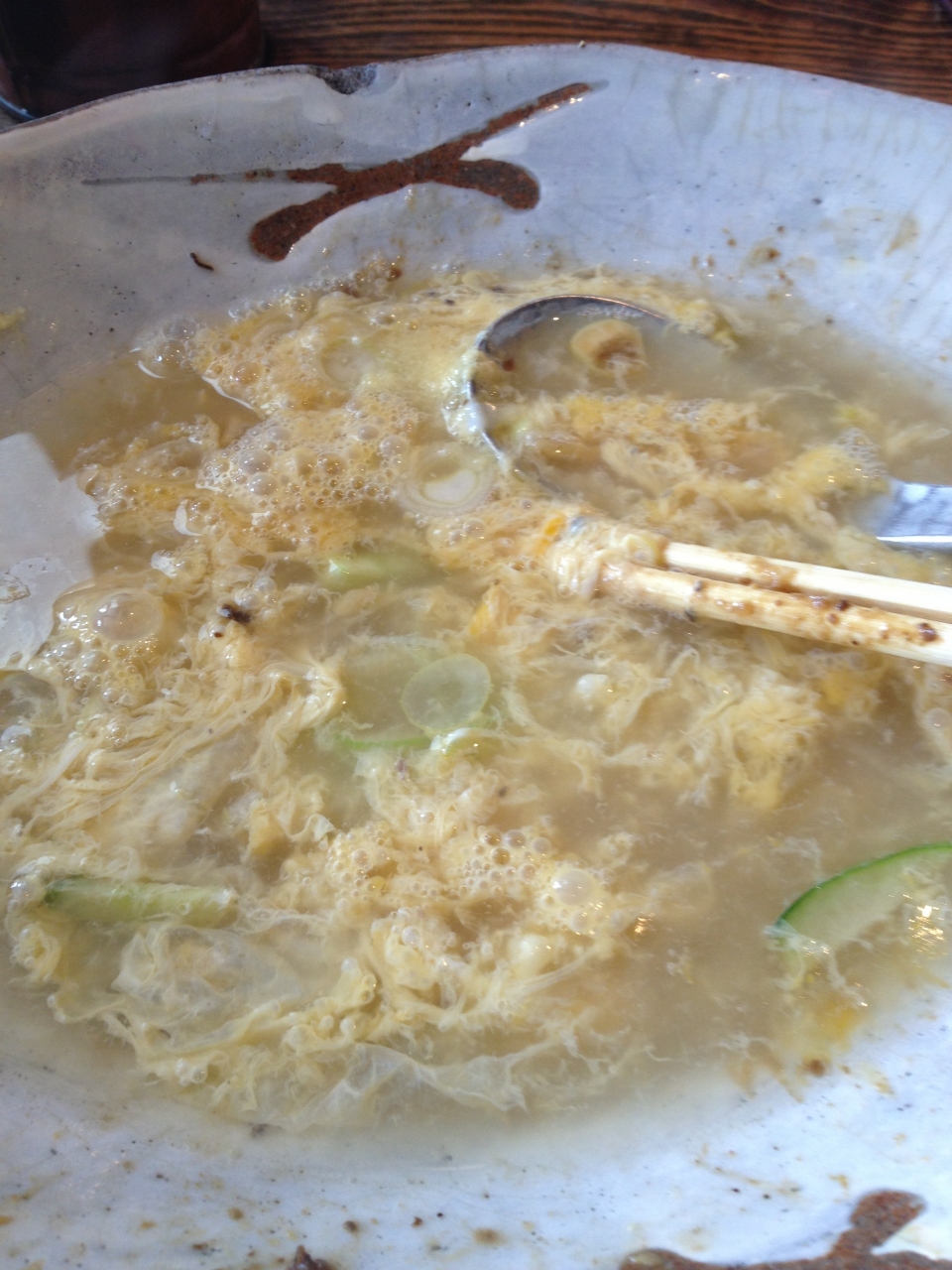 じゃじゃ麺を食べた後に、皿にうどんを2、3本を残しておいて、そこに生卵に落として、店員さんに渡すとスープを注いで、かき混ぜてチータンタンを作ってくれる。