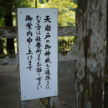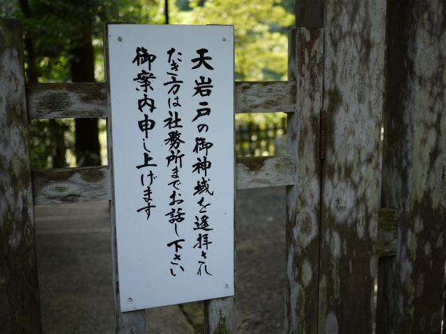 天照大御神様が隠れた天岩戸。受付で『天岩戸に行きたいのですが』と、とんちんかんなことを言ったため、『天岩戸は御神体なのでいけません』と言われました。対岸の東本宮から見ることができます。宮司のお兄さんの説明付きで、案内していただきました。岩戸は樹木に隠れ、その全貌は見られませんし、洞窟の上の部分はなく、洞窟の姿でもありませんでした。鹿児島にも高千穂がありますが、宮崎の高千穂との関連もわかりました。