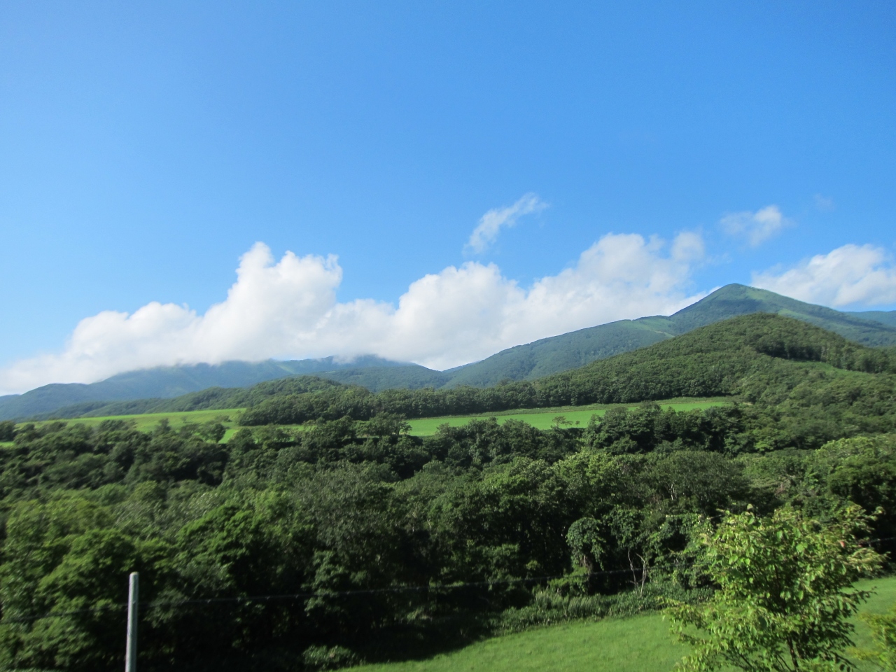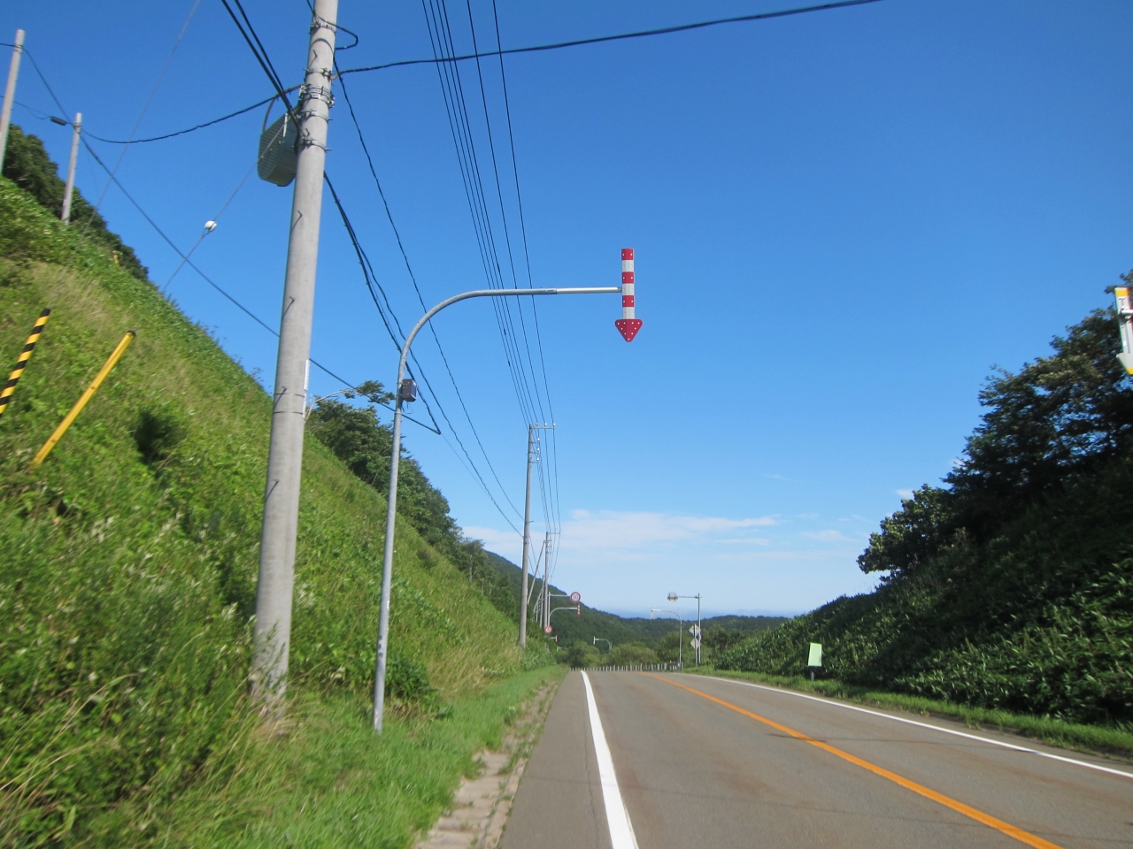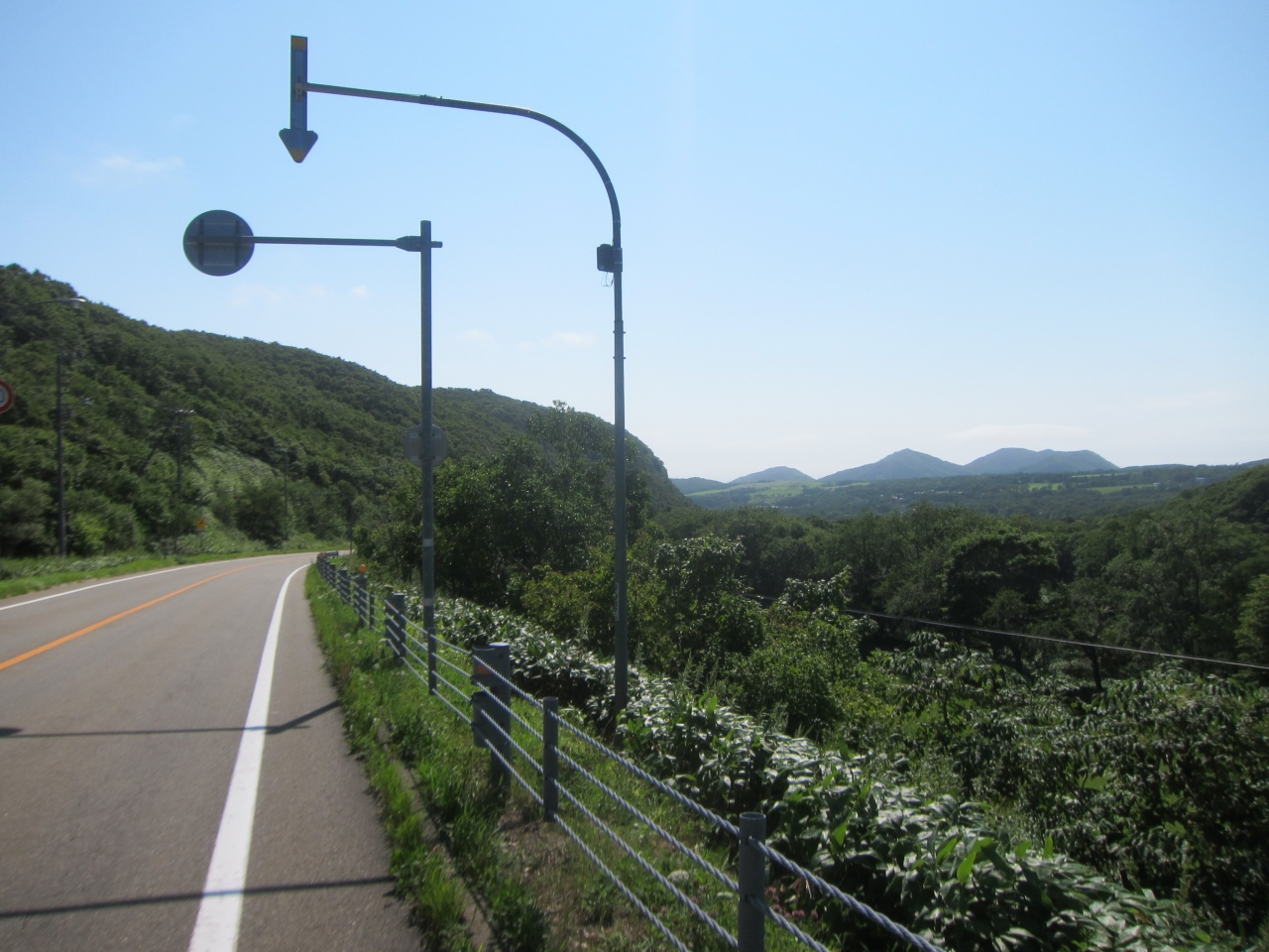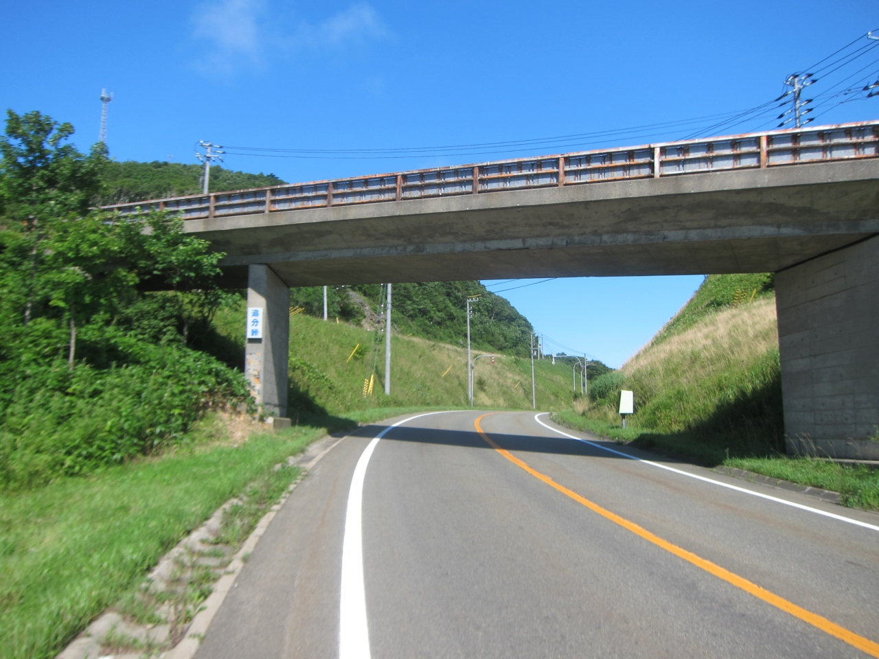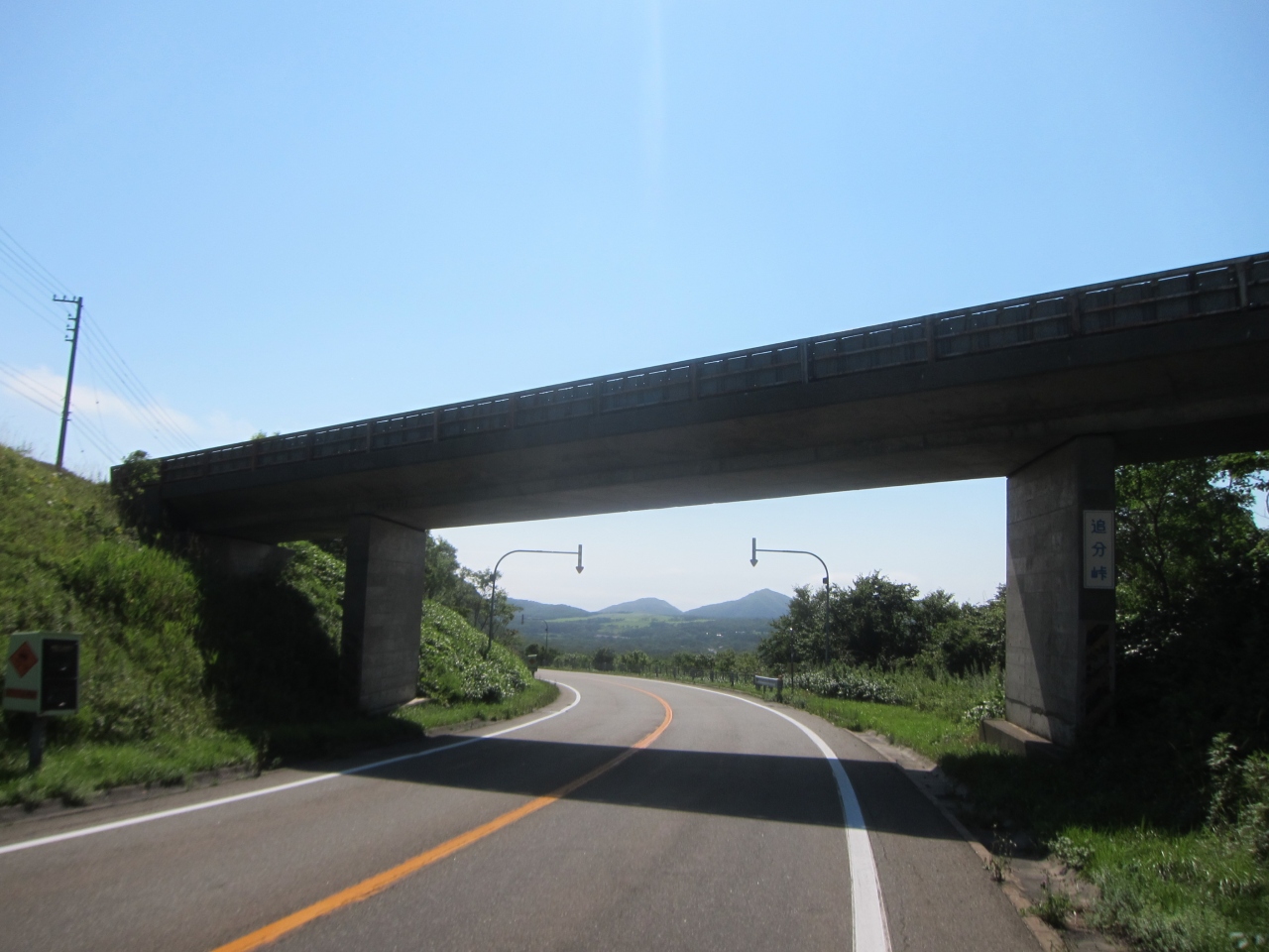 襟裳国道336号線をえりも町から進み、えりも岬に寄らずに帯広、広尾方面へショートカットする途上にある峠です。えりも町からは、しゃくなげ公園の先、コロップのあたりの分岐でえりも岬方面への道道34号線を進まず、そのまま336号線を山側へカーブして、7~8km進むとあります。更に10kmほど進むと反対側の海に抜け、庶野(ショヤ)の集落に着きます。標高166m。えりも岬方面の展望を期待したのですが、日高山脈側の豊似岳や観音岳が見えるだけで、海側の展望は開けません。峠なので山地の少しくぼんだところを越えており、周囲の小高い丘と森に囲まれ、緑が見えるのみです。そのためどの車も通過点として通り過ぎていくのみです。峠付近に作業道の高架橋がかかっており、袂に追分峠の表示がありました。途中、牧場や畑があるので人家もまばらにありますが、さすがに峠付近にはありません。お店や自販機も当然無く、えりも町または庶野で調達する必要があります。えりも岬を付け根から眺めるには、豊似岳や庶野の猿留山道から眺めるほかはないようです。