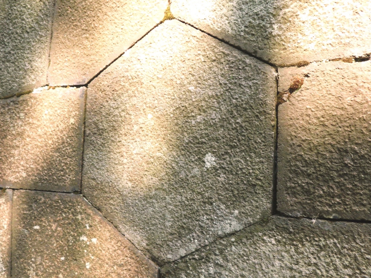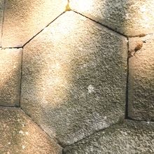 現在は門はありませんが、一番の見所は、大火から建物を守った亀甲石があることです。土橋門石垣 切込みハギの技法が用いられています。石垣に組み込まれた六 角形の石(亀甲石)は、水に親しむ亀を表したもので、防火の願いが込められているそうです。