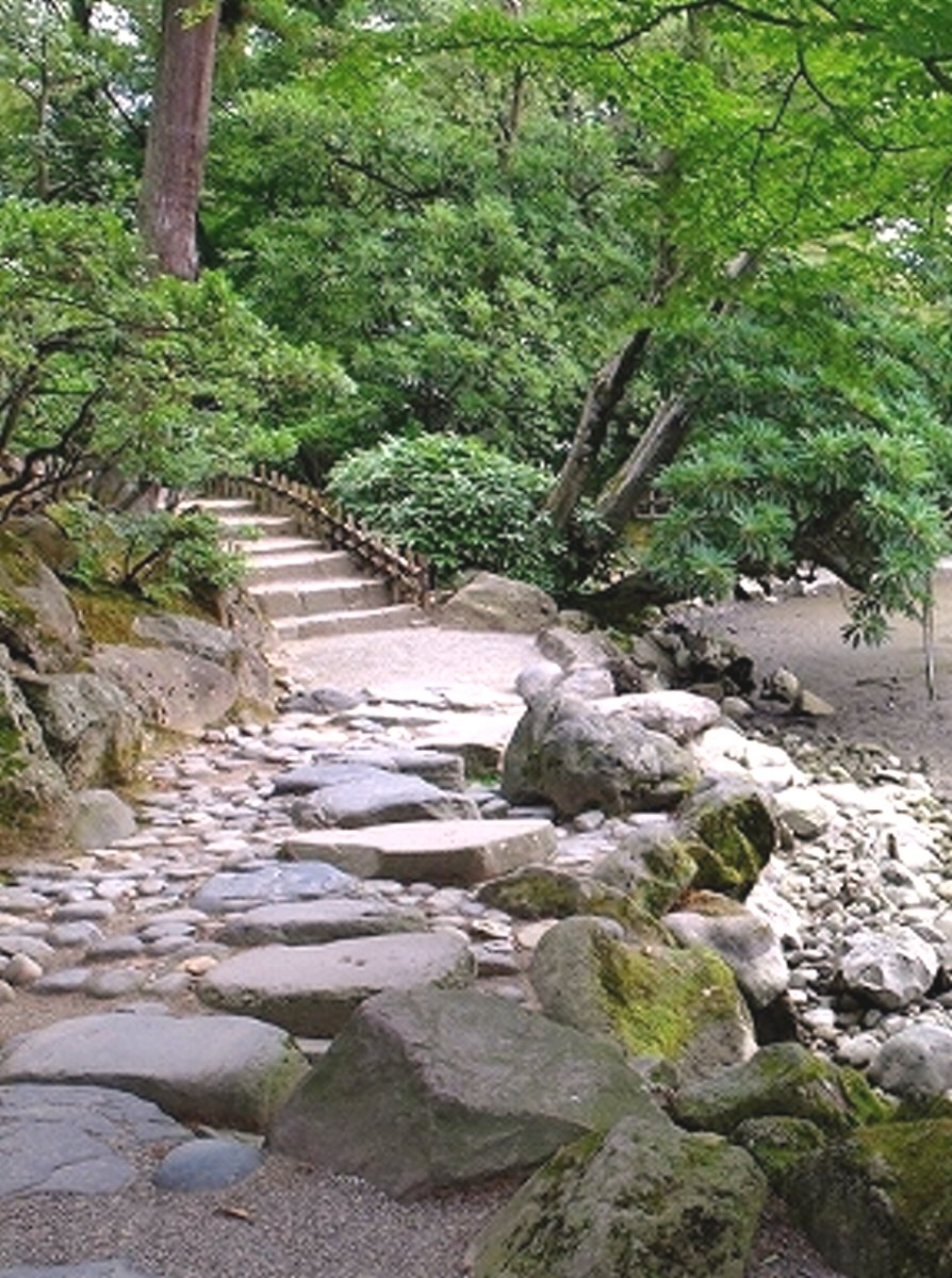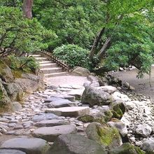 霞ヶ池の水際に迫る山腹と、配置された岩の荒々しさが、 北陸道の難所、新潟県の親不知海岸を連想させることから名付けらたそうです。水際の各石は池の水の増減によって見え隠れし、それを計算に入れて配置されている。とのことです。