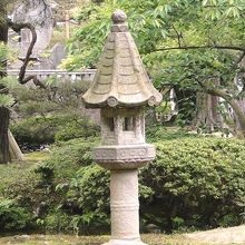 鶺鴒島の上流、曲水のほとりに立つ、園内唯一の蓮華寺型灯籠なんだそうです。ちょっっと私的にはユーモラスな印象を受けました。高さは1m90cm。笠の背が高いのが特徴。当時としては、沢山の技巧が凝らされた灯籠なのでゆっくりと見たい。