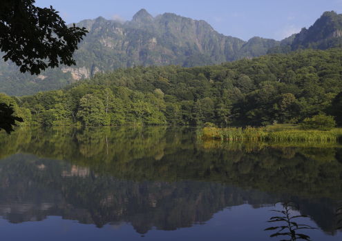 明るい時間に湖畔に行くと、ため池(鏡池)に戸隠連邦が投影されており素敵でした