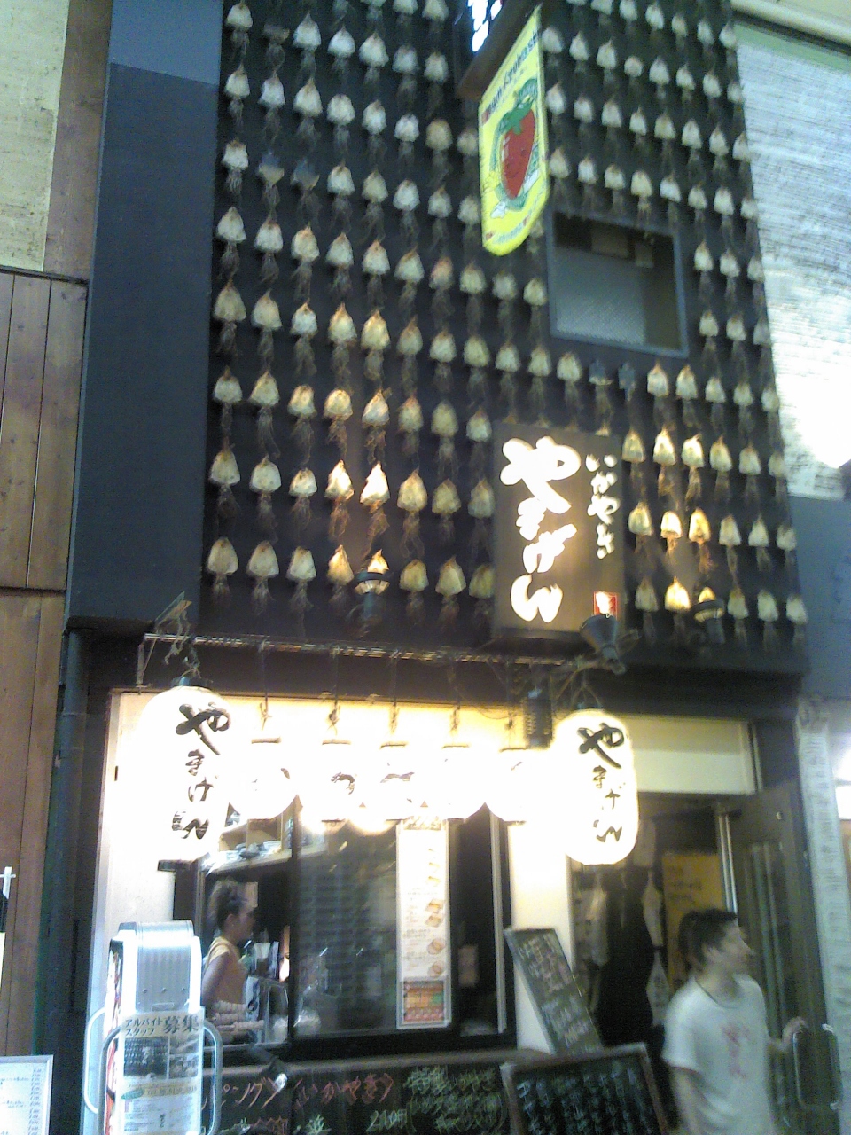 京橋商店街にひときわ目立つ外観!外壁に「いか」がキレイに並んで貼り付いてるから目立ちます!いかやき専門店みたいなので1度食べてみたいと思ってました。店内は数人座れるカウンターと奥にテーブル席が2つというこじんまりしたお店です。店員さんに聞いてお腹が空いてたので、特製いかやき(そば入り)¥680を頼みました。なんかいかやきなんだかお好み焼きの中途半端なものなのか…よくわからない。とても中途半端な味と食感でした。トイレが2階に上がって靴を脱いでハイハイで?行くんですけど…いいですか?って言われてびっくり!!我慢してそそくさと出ました。常連さんはどうしてるんでしょうねえ…なかなか不思議なお店でした。