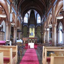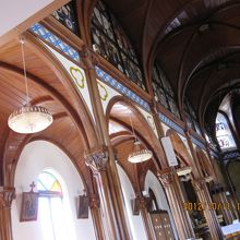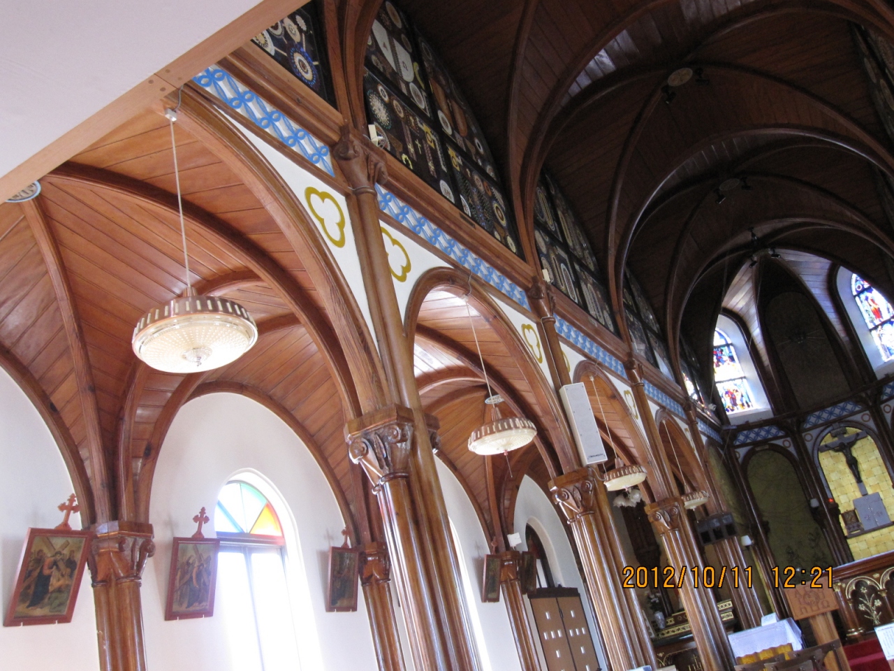 意外と小ぶりの教会で、地元にしっくりなじんでいる雰囲気の教会でした。訪れた時テレビ局の取材があるとのことで土地の信者の方がおいでになり、この方から丁寧に説明をいただきました。この教会も鉄川与助の設計だそうで四か所目の教会、木造アーチ式の天井は美しい木目が見え壁面には幻想的な装飾が施されていました。