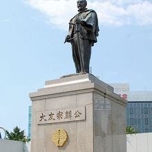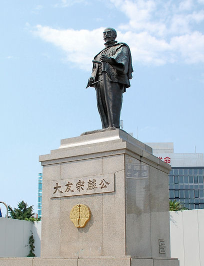 この大友宗麟公の立ち姿の像が、JR大分駅前にそびえるように建っています。