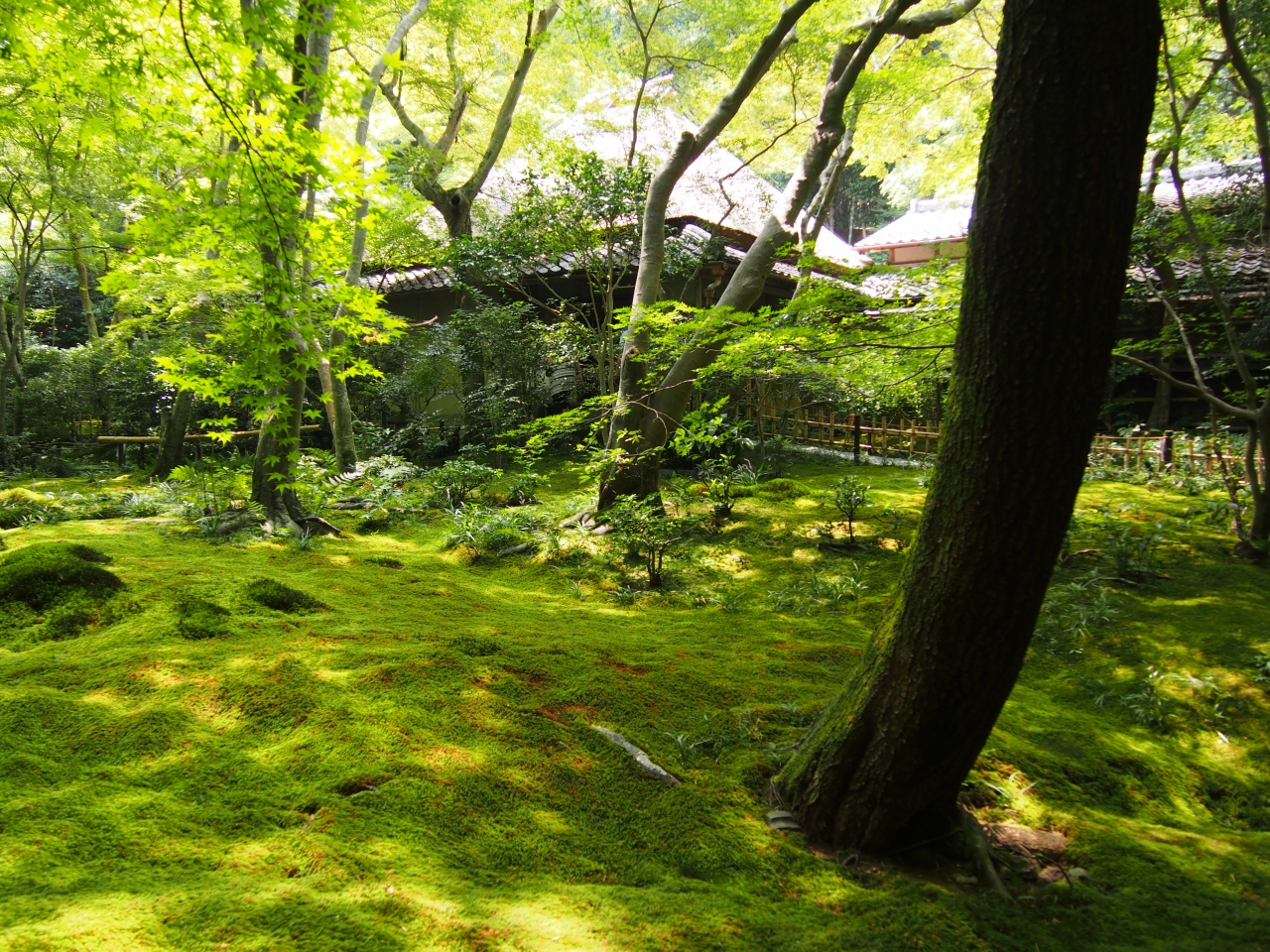 苔がとてもきれい、かえでの緑そして茅葺のお堂と良くあっています。