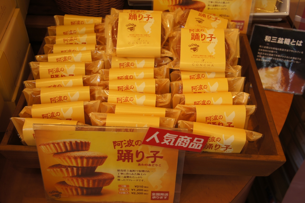 PATISSERIE CONCHAは、新町橋の大通り角にある洋菓子のお店。阿波和三盆糖を使ったお菓子がいくつかあって、「阿波の踊り子」というマドレーヌをいただきました。けっこう大きいし、濃いバターの香りがおいしいです。ただ、和三盆糖の甘さは、和菓子に使われているのと比べると、ちょっと分かりにくいかもしれません。