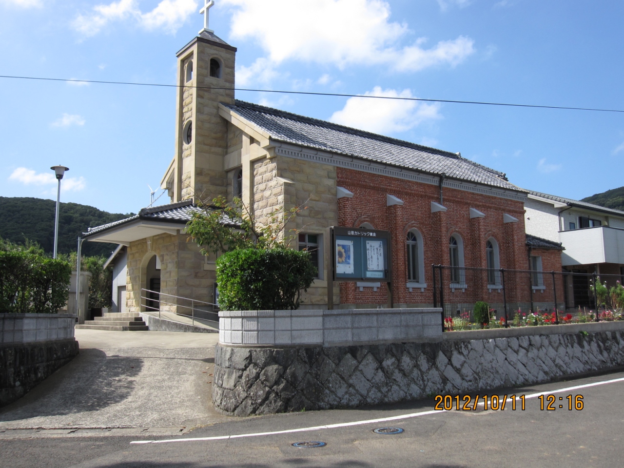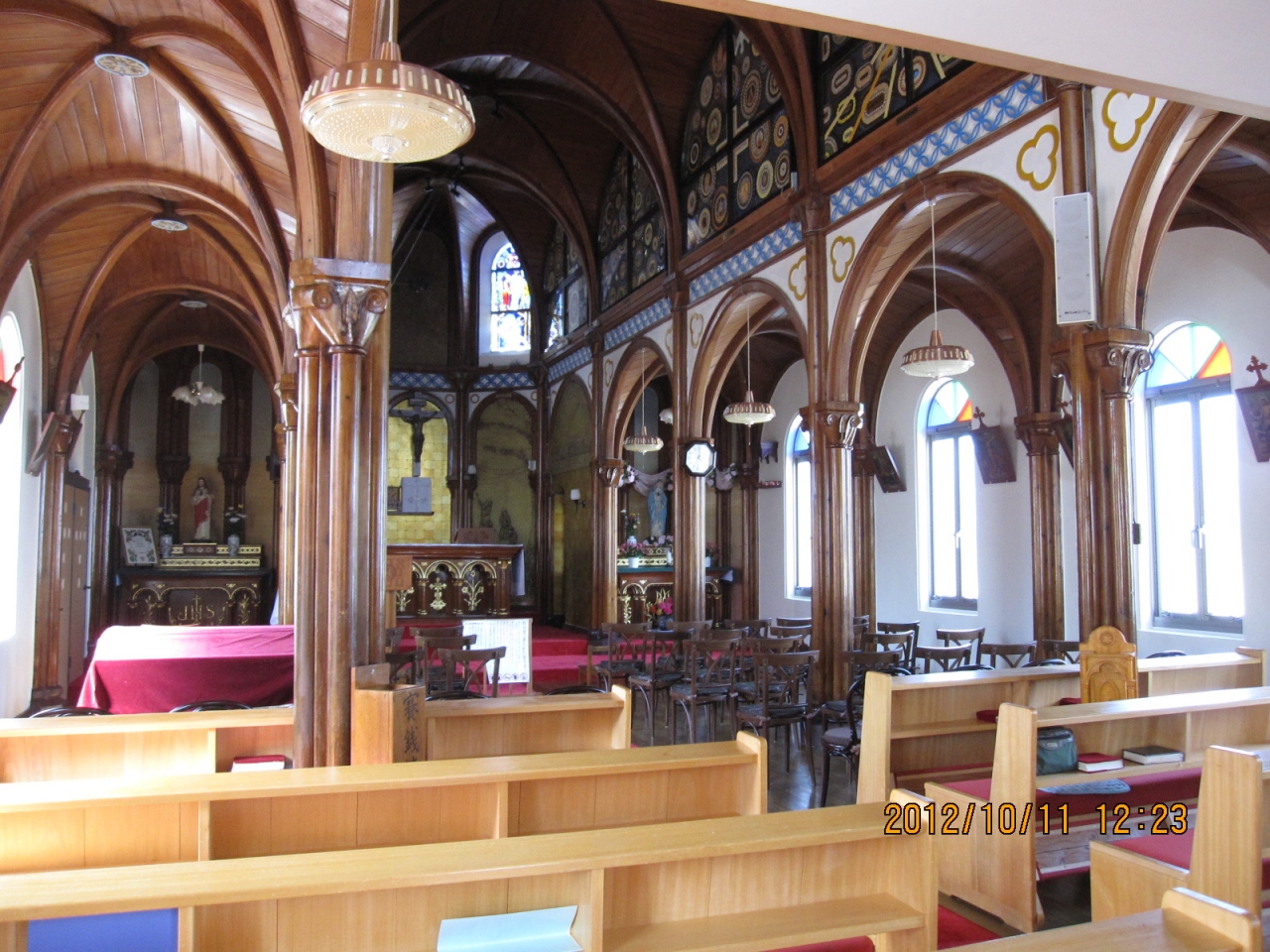 平戸島より北部の生月島にあり この教会は復帰信者の為のカトリック教会として建てられたそうです。外観はシンプルな形で地味ですが 内部は木目が引き立つ独特な空間で目を引かれます。壁面にはちょうの羽を切り取り円形に仕上げた装飾品が多数あり非常に圧倒されました。