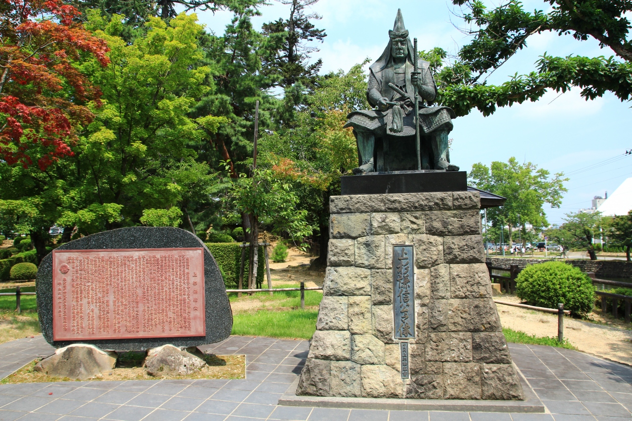 米沢城内にある上杉謙信像です。有名な像ですが意外と小さく、床几に座っている像ですので、軍神といった精悍なイメージではあまりありません。上杉鷹山や直江兼続の像はこの他にもいくつかありますが、謙信の像はこちらだけのようです。