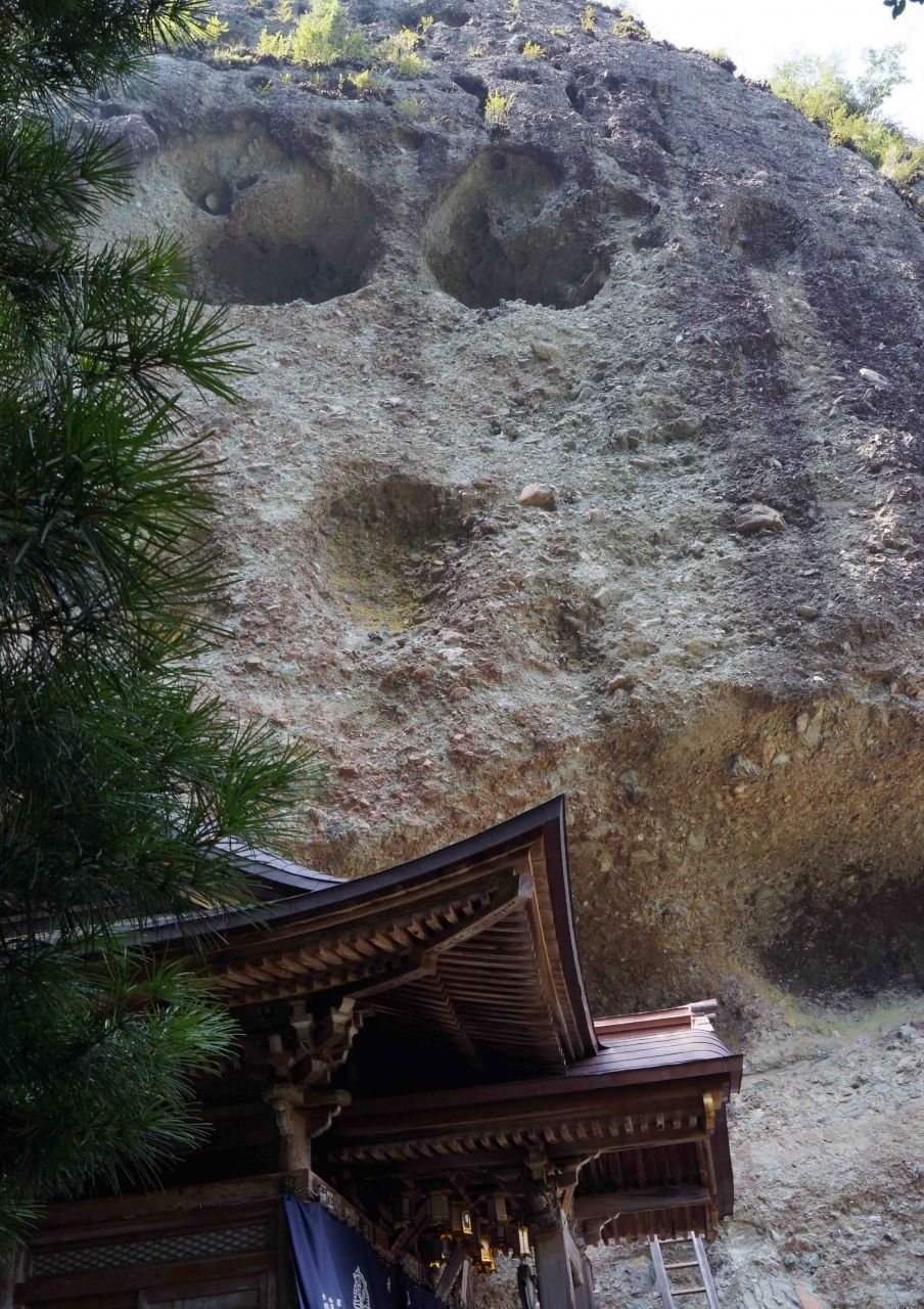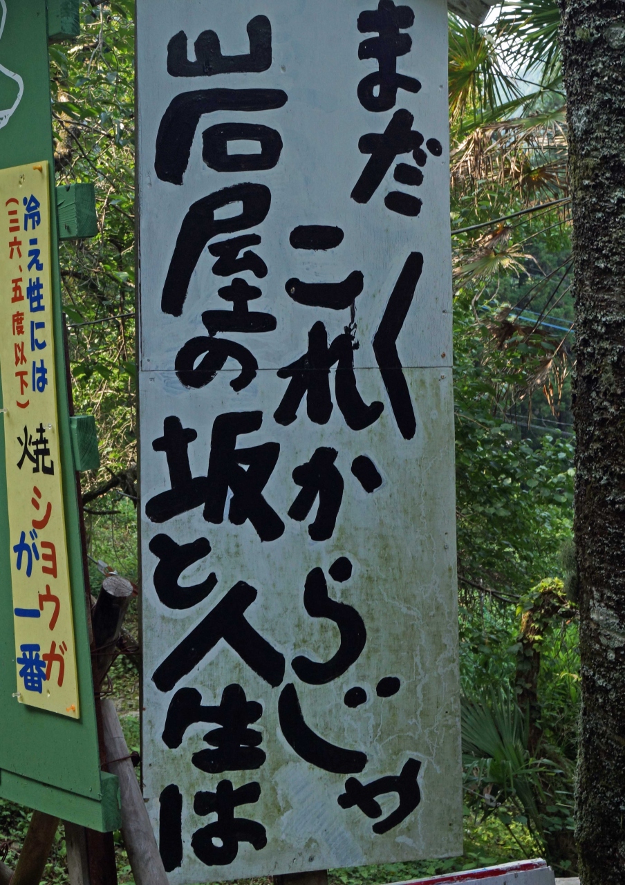 四国遍路88ケ所 45番 岩屋寺は、奇岩奇峰の深山にありと言われています、急な坂道を歩いて登り、さらに山門を入ってからも樹木の生い茂った中を階段と坂を登り続けねばなりません。坂の途中に書かれた“岩屋の坂と人生はまだまだこれからじゃ”が身にしみます。又、登坂路の途中にある不動明王と童子の像も人生の厳しさを感じます。本堂をおし包むような背面の奇岩は巨大な人面に見え、本堂を守っている様に思えます。