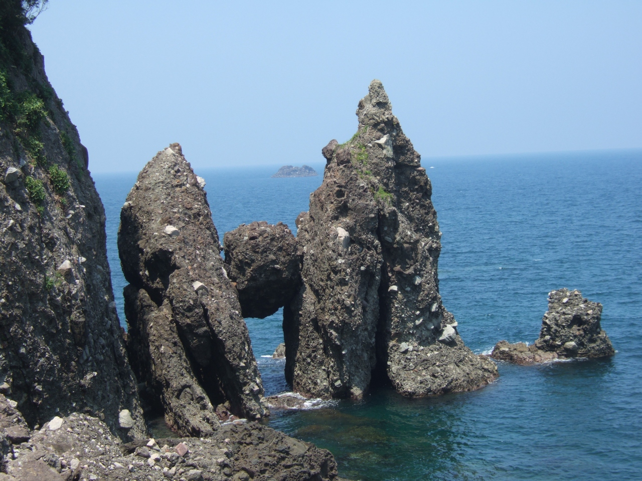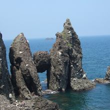 縦に長い岩と岩の間に丸い岩が挟まっていて今から2300万年前から500万年前の間に出来た形です。カニのハサミに挟まれた様な珍しい岩です。