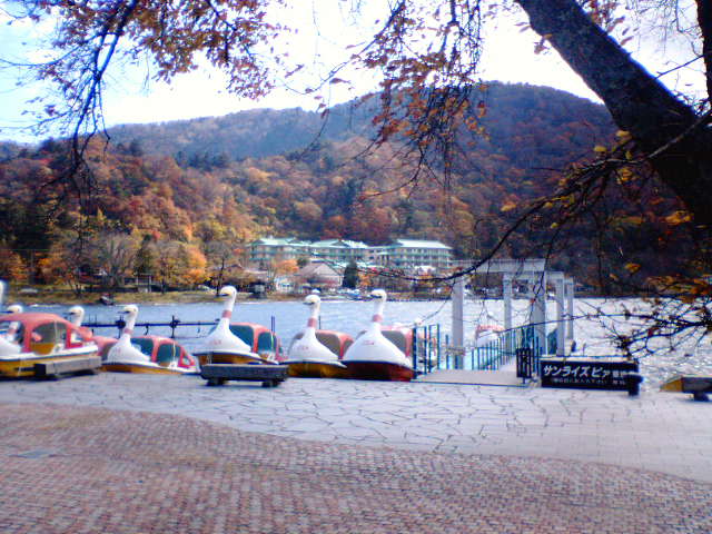 湖沿いの遊歩道には様々な色に染まった紅葉が並ぶ他、遊覧用のモーターボートや貸しボートもあり、湖上から周囲の山々の紅葉、男体山の山肌を楽しめます。
