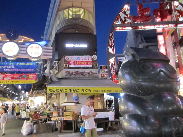 上野駅と御徒町駅の間にある、高架下を利用した商店街です。時間帯にもよるかもしれませんがアメ横のゲートをくぐるとちょっとした異国心地を味わえます。大晦日のニュース中継で有名な魚屋さんの前を通ると、カットフルーツを売っている商店、ケバブを売っている屋台などが並んでいますが、店員さん・お客さんともにどちらかというと日本人以外の国籍の人の方が多いような気がします。そのあたりの一種、胡散臭さも楽しみながらお店を冷やかすのも一興かもしれません。