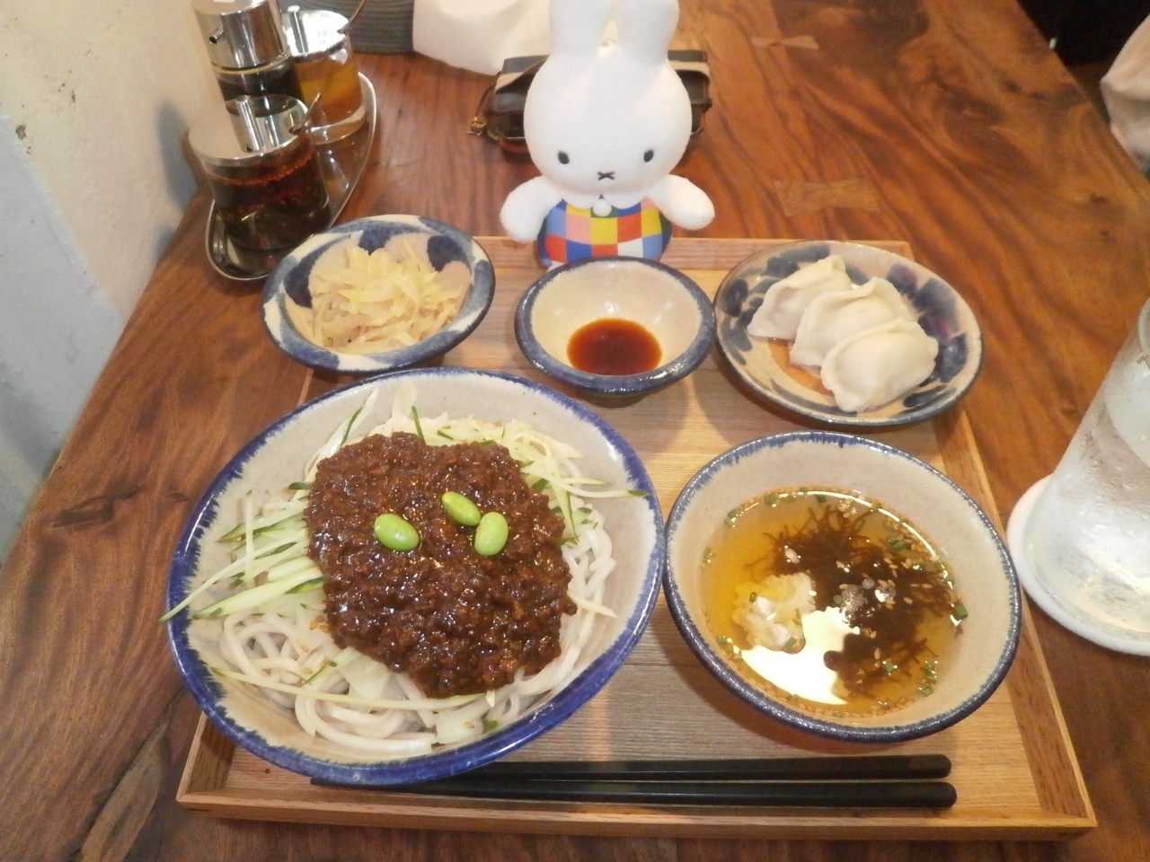 頼んだのがランチセットです。ジャージャー麺に餃子も入っていましたので、色々と頂きました。店内の各テーブルにあるラー油をつけて食べると美味しかったです。