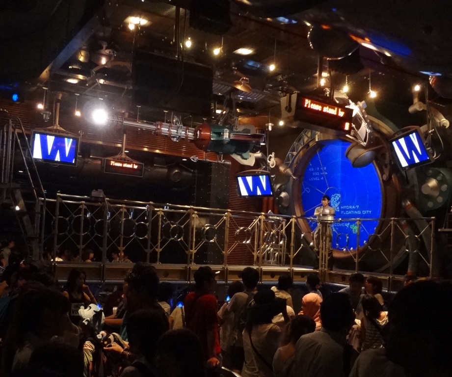 東京ディズニーシーで待ち時間40分にひかれて入ったのがストームライダーでした。飛行型気象観測ラボ、ストームライダーという飛行機に乗って、台風の穴に飛び込み、「ストームディフューザー」という爆弾のような物を投下して、ストームを消失させるという趣向。前面の大型スクリーンでストームライダーのスリルいっぱいの飛行を楽しめます。どんなスリルかの種明かしはルール違反。ただし、間違いなく冷(ひや)っと、できます。