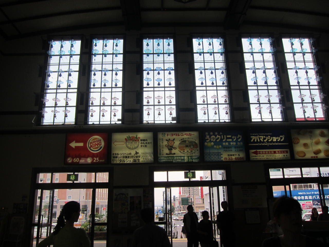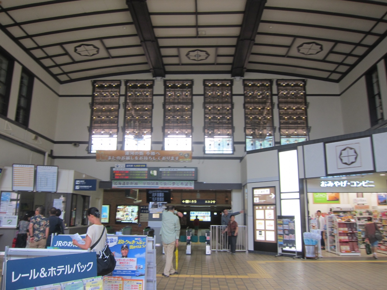 運河の街、小樽の観光の拠点です。札幌までの通勤圏で朝夕は通勤客でも混みあいます。有名な運河は、駅前の通りをまっすぐ1kmほど坂を下ったところ。少し離れていますが、バスでも行けます。市内各所をバスで回るのであれば、\750円の1日乗車券などもあります。駅前にはバスターミナルがあり、小樽市内各所は勿論、札幌までの高速バスや積丹半島、岩内などへも行くことができます。キロロへは季節限定となります。列車の方は、札幌までは普通列車、また、新千歳空港まで行ける快速エアポートが頻繁に出ています。一方、反対方向の倶知安、ニセコ、長万部方面は1~2時間に1本程度なので利用には予め時刻表をよく確認しておく必要があります。駅舎側の4・5番線ホームは裕次郎ホームの愛称がついています。駅にはキオスクのほか、パン屋などの店舗が入っていて食べ物の調達に便利です。待合室もありますが、駅の規模の割に小さめです。その代わりでしょうか、大きめのロッカースペースとトイレがありました。
