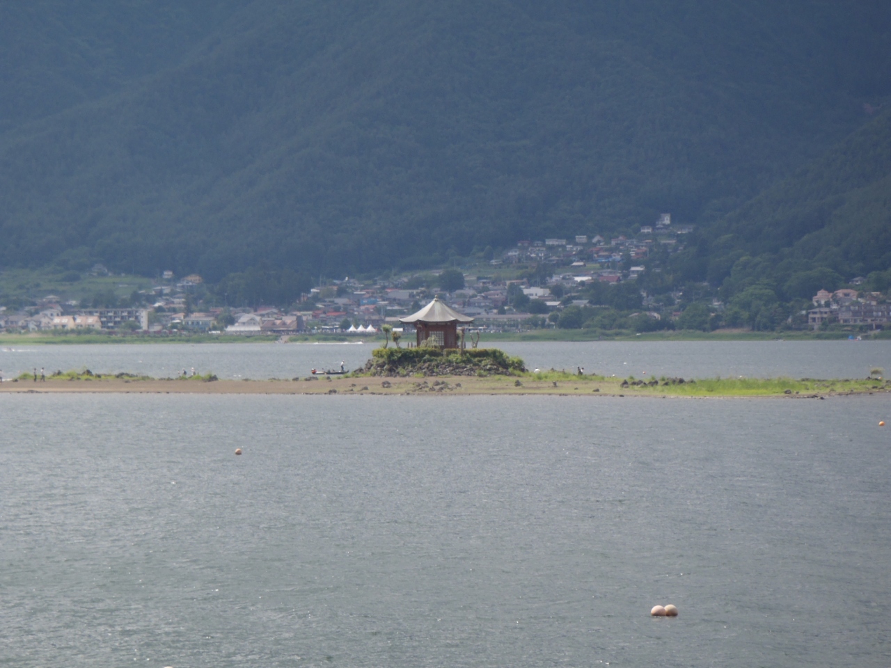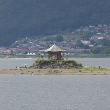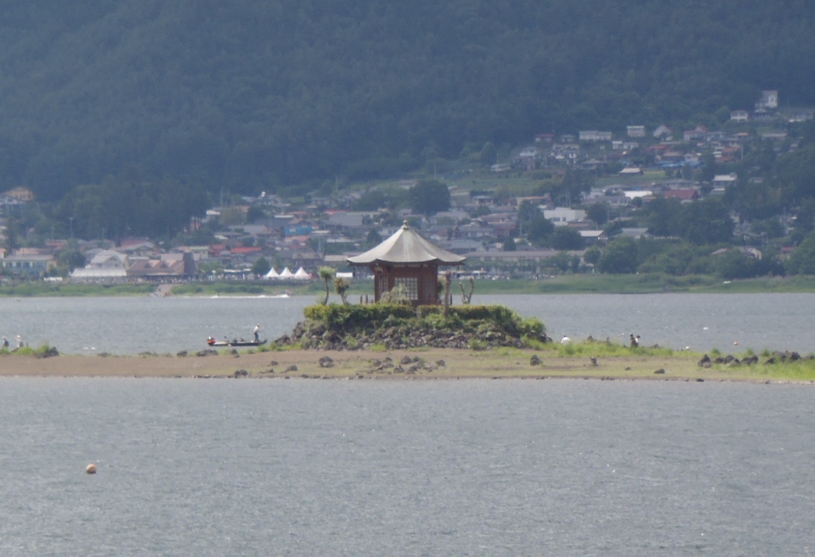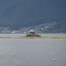 河口湖南岸付近には「湖に浮かぶ不思議なお堂」と目を引く建物がある。