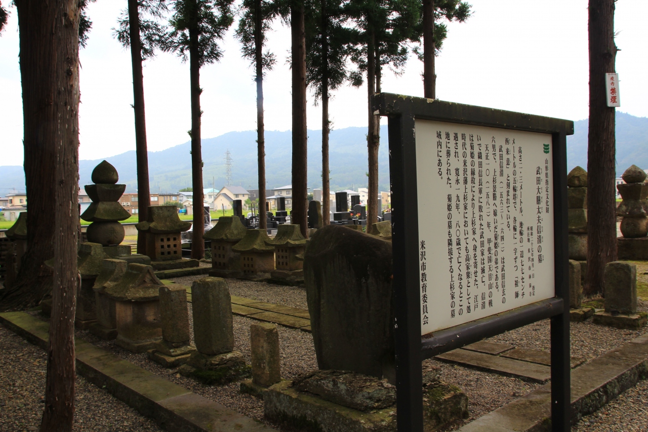 武田信清と言っても、数いる武田家の武将の中でも知られていないほうだと思います。しかも、それがライバルの上杉家の菩提寺で…というのは歴史の面白さです。詳しくは写真の案内板を読めばわかりますが、武田家滅亡後に菊姫を頼りに上杉家の食客となって加盟を江戸時代に伝えたようです。
