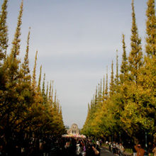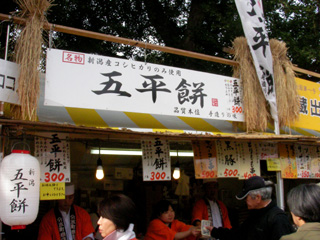 暖かい日が続いたせいでイチョウの色づきは今ひとつですが、各地の物産の出店が出ています。いつものようにみそだれの五平餅(300円)、盛岡のせんべい汁(300円)、中華セット(1,000円)、みたらしだんご(100円)などを食べて、おみやげにソーセージ盛合せ(600円)を買いました。大道芸を見てのどかな時間を過ごしました。