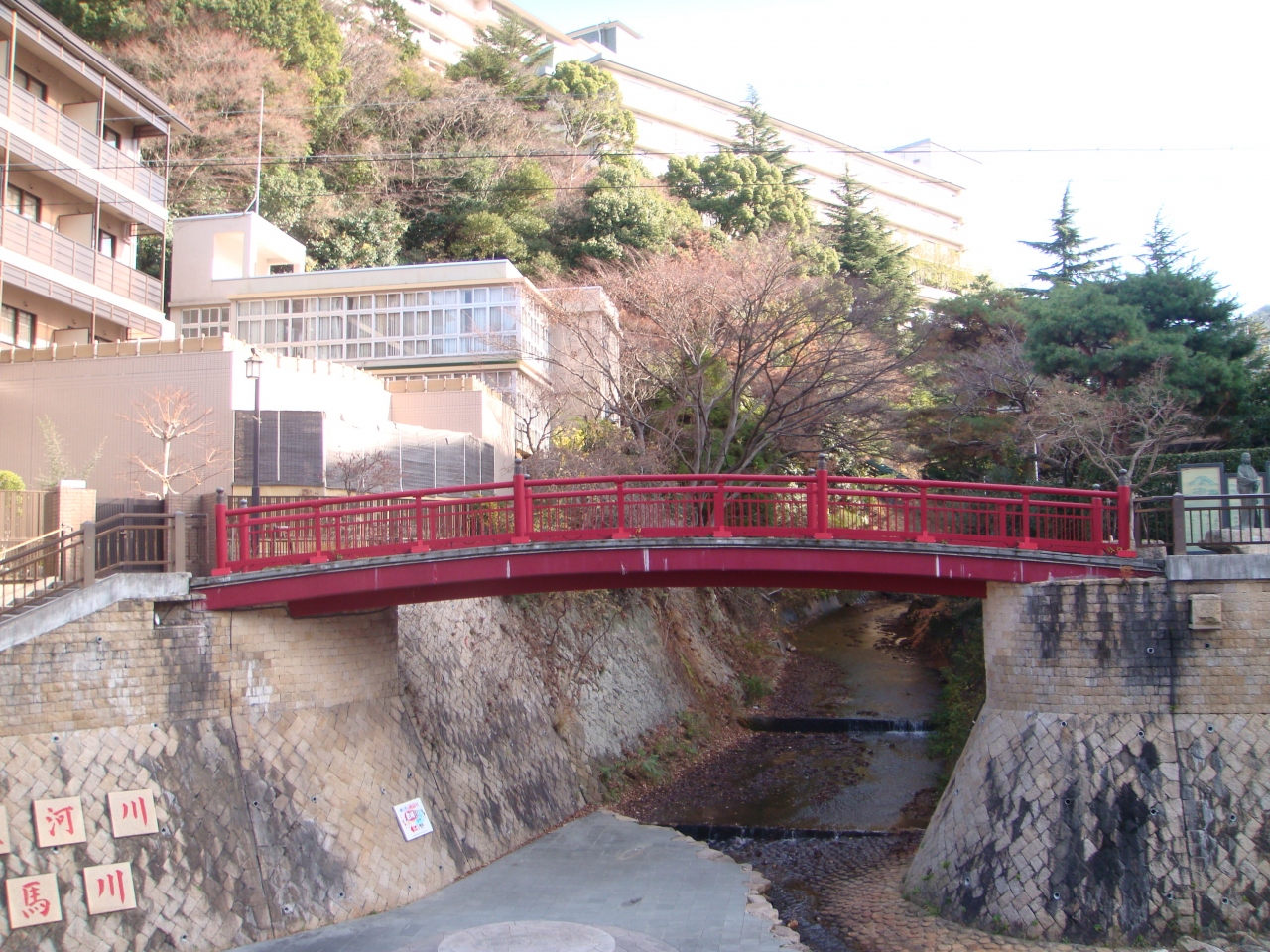 ねね橋は有馬温泉街に流れる有馬川に架かる赤い欄干の美しい橋で、一際目立ちます。
