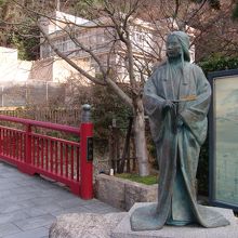 橋の袂にはねねの像があります、湯けむり広場にある秀吉像を見つめています。